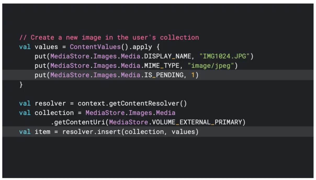 如果你正在查询 Mediastore 然后你发现里面有一些隐藏的,也就是它的 IS_PENDING 标记被设置为 true 的这些项目,然后你又确认你的应用,真的去需要访问这些项目。 我们现在还有一个接口叫做 setincludePending(),通过调用这个接口,你可以设置获取到这些被标记为 IS_PENDING 的 item,但是即使你能获取到这些 item,你还是不能去访问里面的具体的数据的,只有这些 item owner 的 app 可以把 IS_PENDING 的标记设置为 false 之后,才可以去访问项目里面的具体内容。如果应用有需要在媒体代码里面去访问这些打开的文件,首先你需要在你的应用的 Java/Kotlin 代码当中打开文件,然后把这个打开的 find script 传递给你的 code。