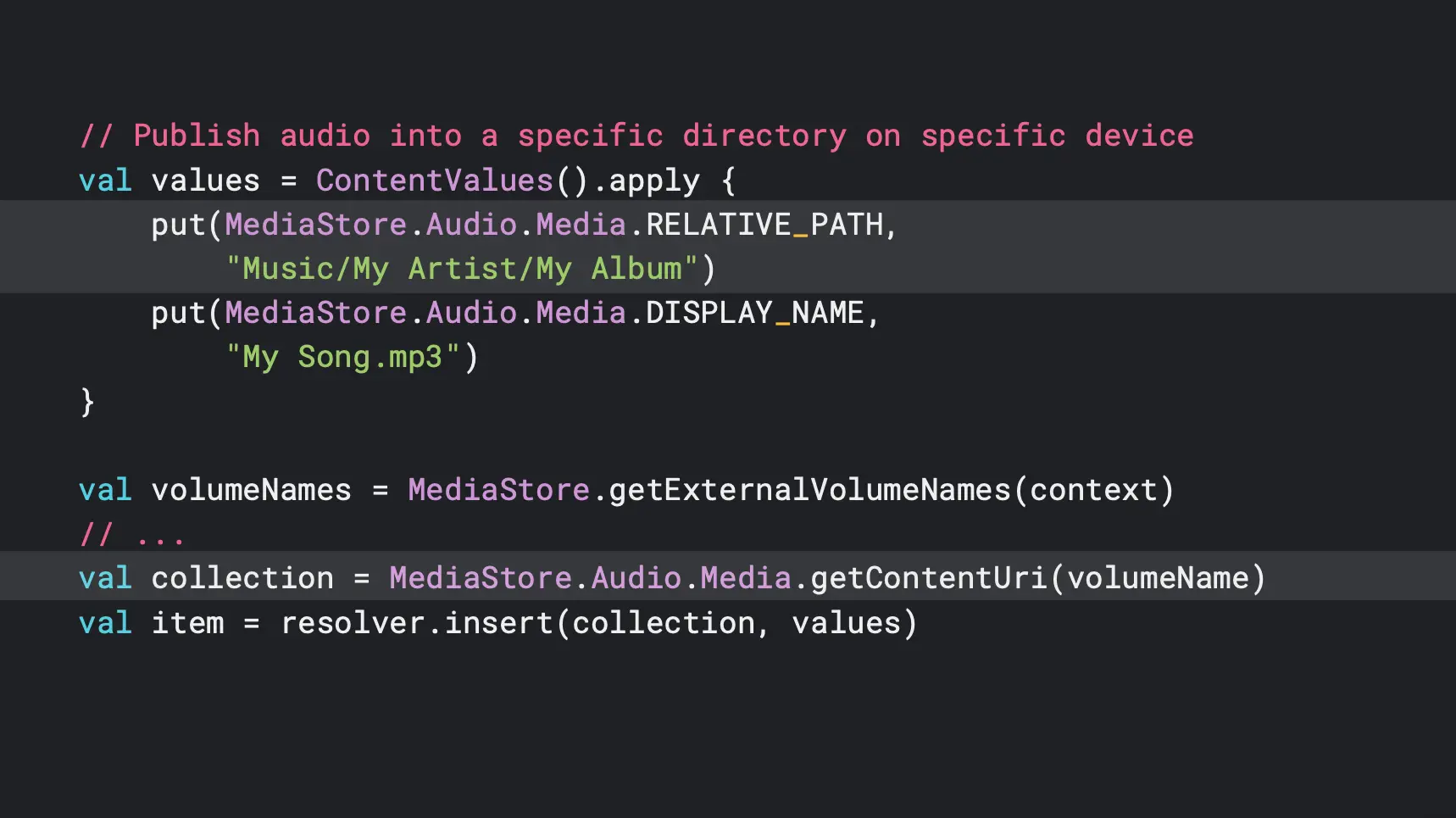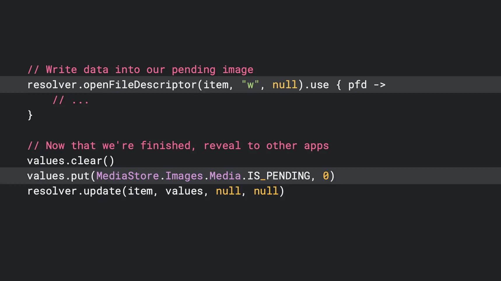 我们看到高亮的 IS_PENDING 这一行,这里是把 IS_PENDING 设为 True 的,表示对应的 item 还没准备好,希望系统能够暂时隐藏,直到准备好。这个是在执行一些运行时间比较长的处理,或者是等待加载的时候会比较有用。只有 item 的所有者程序,可以在项目被标记为 IS_pending 的时候去访问里面的内容。一旦你设置好了这些映射之后,并且确定了 item 的IS_PENDING 状态,接下来就只需要选择一个集合,然后讲然后将 item 存到里面就可以了。