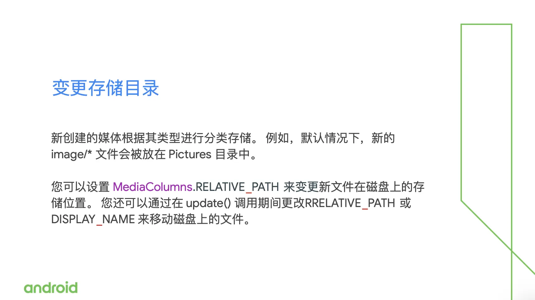 Mediastore 会根据文件的 RELATIVE_PATH 去自动进行分类存储,但是你也可以去设置 MediaColumns 里面的 RELATIVE_PATH,去变更他们在磁盘上的储存位置。系统会尽量确保你使用的 RELATIVE_PATH 是一个合理的路径。比如说对于 image.jpeg 类型的文件,它就会被放置在DCIM或者 photos 目录。
