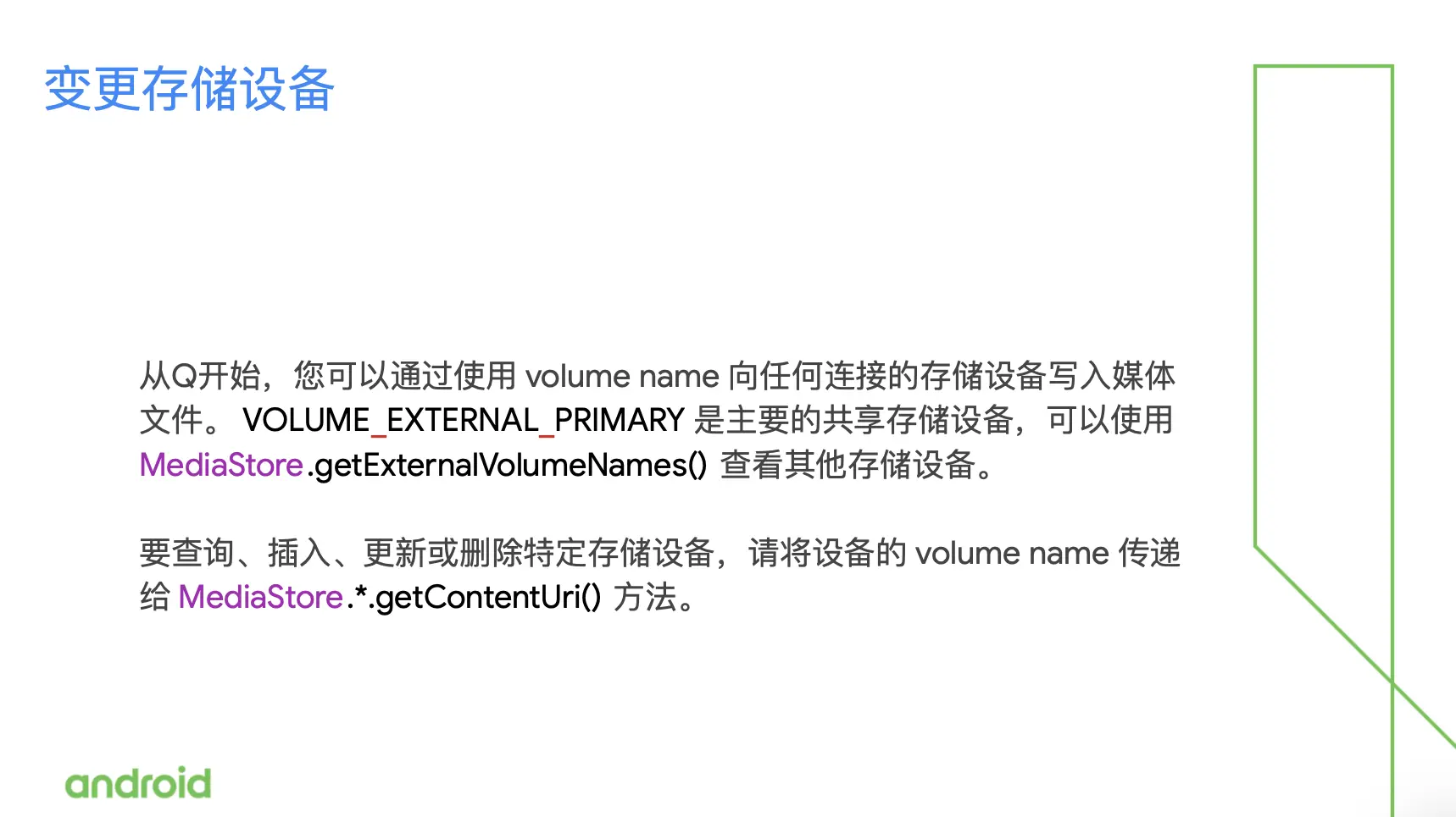 如果你还想去指定保存到某个特定的存储设备上,你可以通过使用 Mediastore 的get ExternalVolumeNames 或者是 get AllVolumeNames,然后去选择你想要的系统设备上所有的 VolumeNames,把它传递给 getContentUri 的方法。另外还有一个接口是 StorageManager 的 Storage Volume 这个方法。它可以告诉你目前系统连上的所有存储设备的底层信息。