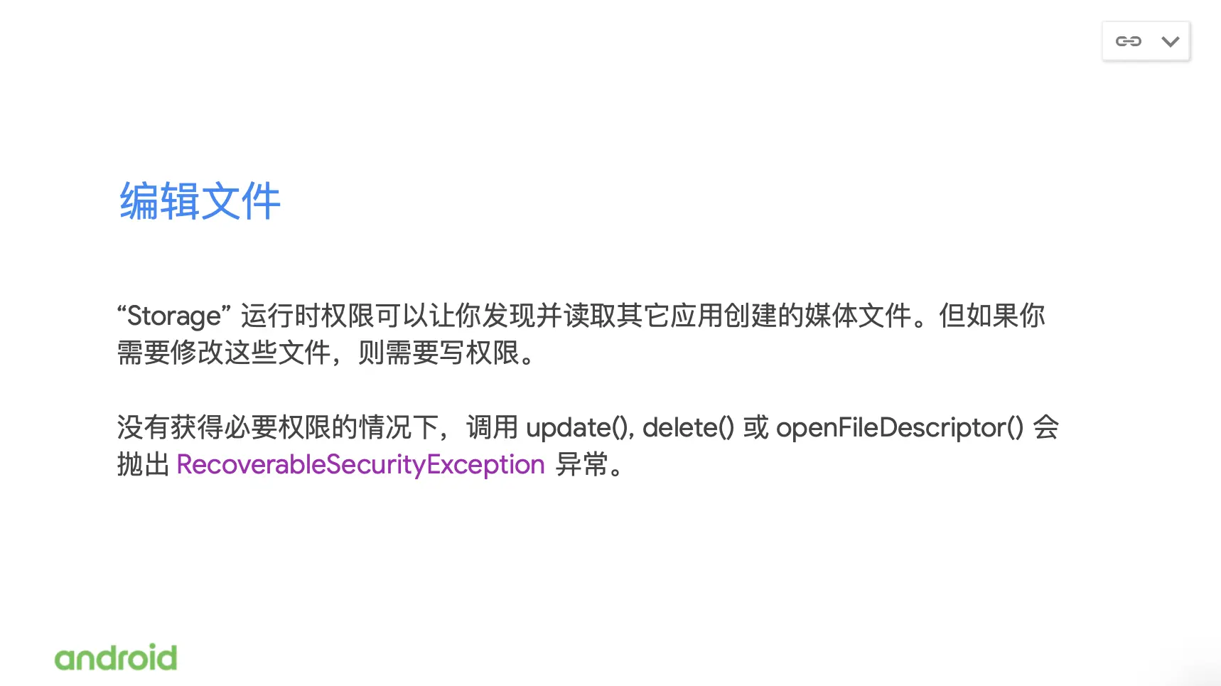 Storage 运行时的权限可以让应用去发现并读取其他的应用,存入到 Mediastore 里面的媒体文件,但是如果你需要修改这些文件的话,你需要去获取 Right_exstorage 权限。如果你的应用没有获取到必要的权限,就直接调用了update/delete/openFileDescriptor 这些方法,那就会收到系统抛出的异常。