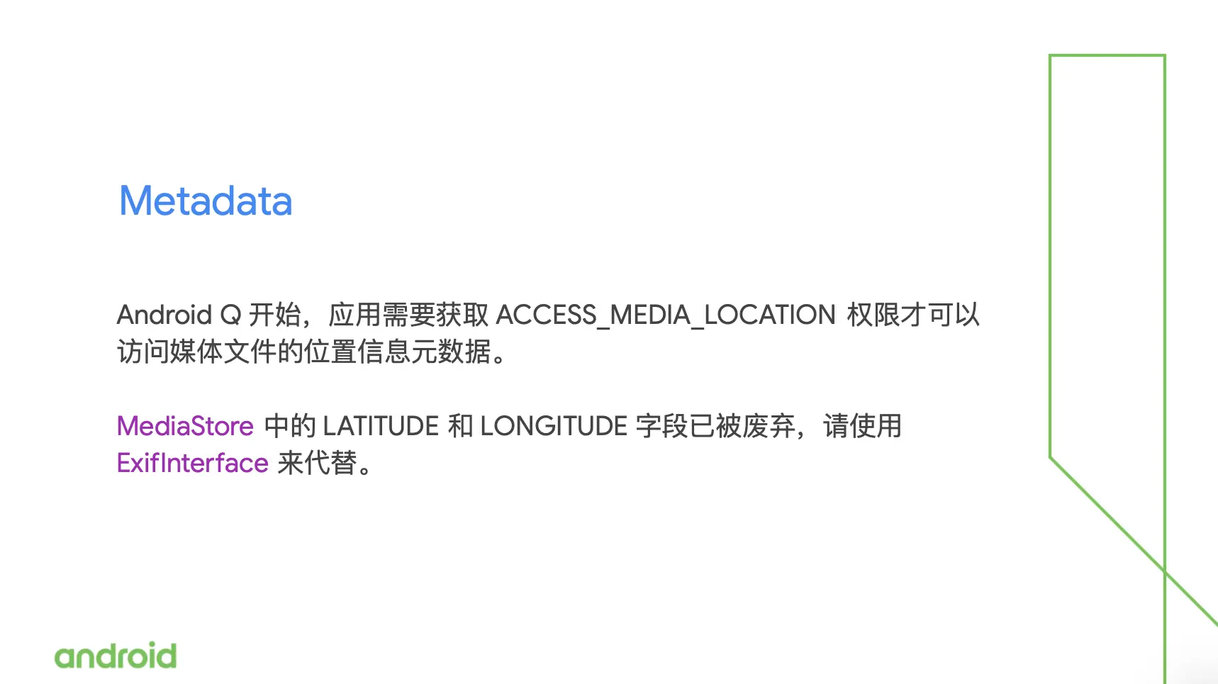 我们还注意到在照片文件中,通常还会有一个原始的地理位置的信息,这个信息是便于用户在之后查看这些照片的时候,还能回忆起这个照片当时是在什么地方拍摄的。但是地理位置信息对用户来说通常是比较敏感的个人信息,默认情况下 Android 会隐藏这个信息。如果你的应用需要去访问照片的地理位置信息,它需要在应用里面去声明 ACCESS_MEDIA_LOCATION 权限,然后还需要去调用 Mediastore 的 Save/Require/Origin 接口来指明需要获取某个 url 对应的文件的原始信息。