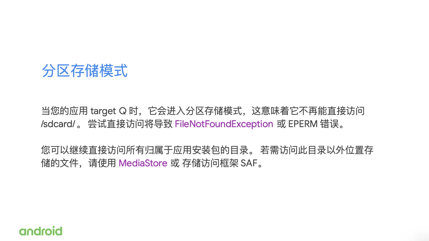 在应用 target Q 时,它就会自动进入分区存储模式,也就是沙箱模式了。这也就意味着应用不再可以直接访问SD卡的目录。如果你在 target Q 的情况下还去尝试直接访问SD卡,这个目录就会收到报错。虽然不可以直接去访问 SD 卡的根目录,但是还是可以直去访问以你的应用的 package 命名的目录。 如果想访问在你的 package name 目录以外的其他的地方的内容,你就必须使用 Mediastore 或者是存储访问框架 SAF。
