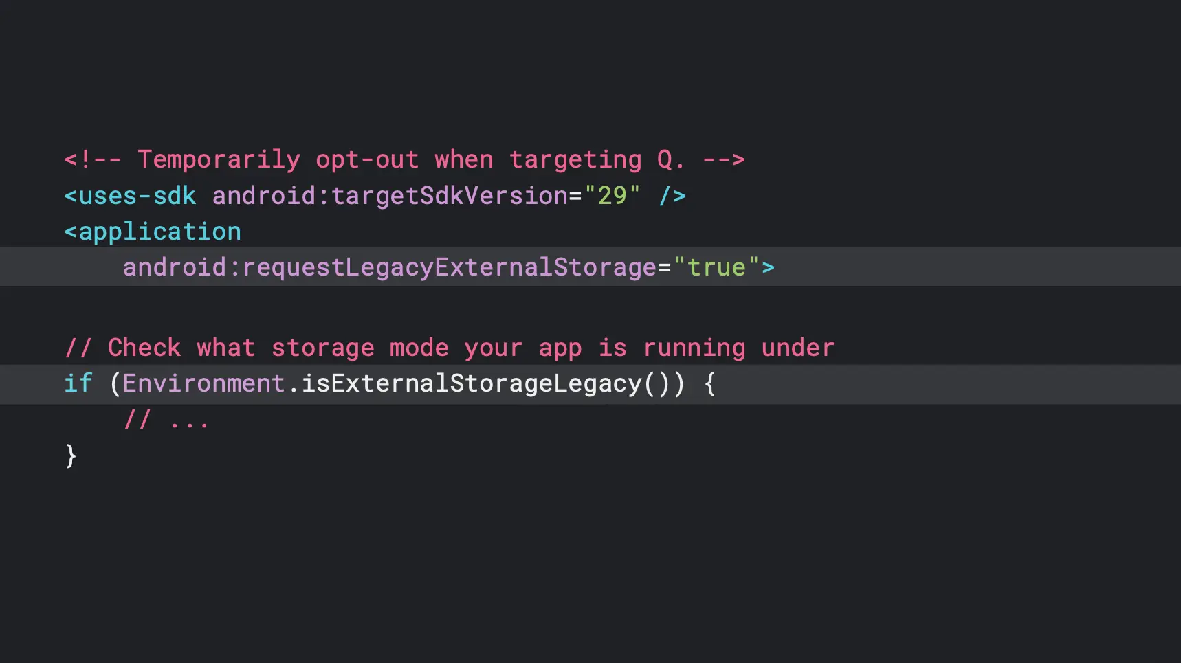 我们刚才提到过说应用程序它在 Android Q 默认情况下,会被放到沙箱里面。然后我们认为这样的设置的变更是适用于绝大多数的用户场景,比如说用户如果想选择一些照片上传到社交网络,或者是在文件编辑器中打开和保存文档,或者是在浏览器里下载文件,这些用户场景都可以被很好地处理。然而我们在发布了 Beta 1 和 Beta 2 这两个版本之后,收到大量的开发者的反馈,普遍是说他们需要更长的一段时间来适配这种变化。所以在今年5月初的 IO 上,我们也宣布了一个在 Beta 1 和 Beta 2 里面没有的一个新东西。 现在应用可以通过加上一个新的标签来选择退出隔离模式。如果你的应用是 Android P 以及以下的版本时,那么这个标签就默认是 false。当然你也可以手动的将它设置为 true。当你将它设置为 true 的时候,无论应用的它给它SDK target version 是多少,只要应用运行在 Android Q 系统上,就会启用隔离存储沙箱模式。我们新增的标签只是一个暂时的解决方案,它的目的是给开发者能够有相对来说更长的一段时间去适配这个变化,而不是说启用了这个标签,你就可以永远的不受隔离存储沙箱的控制。