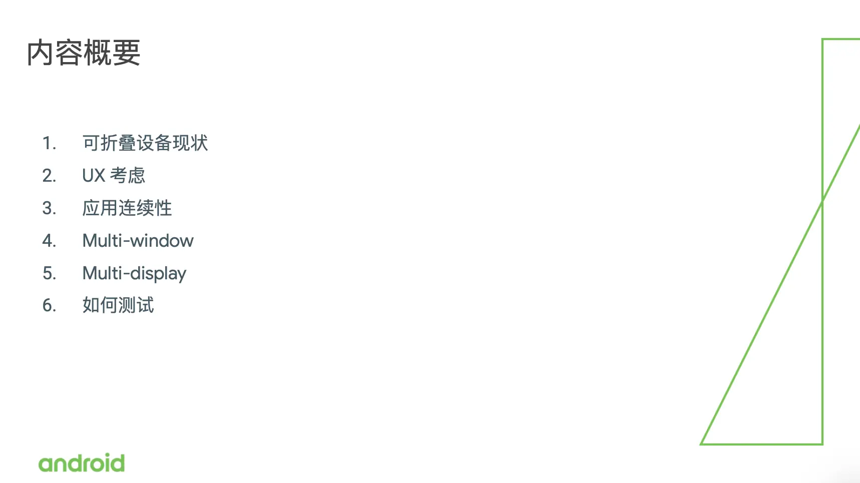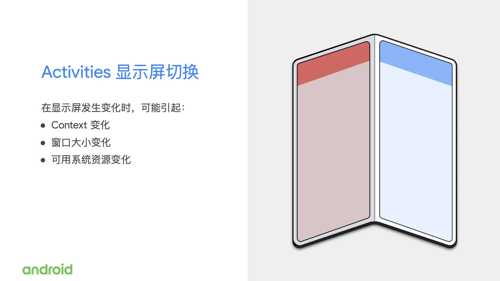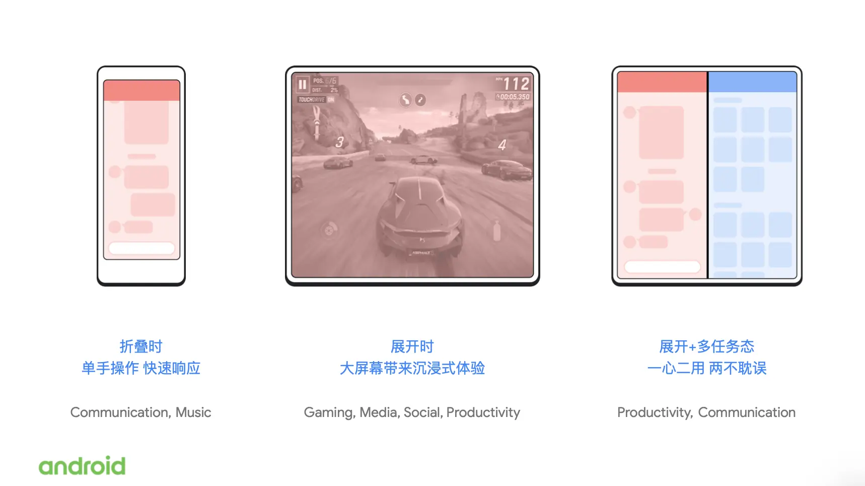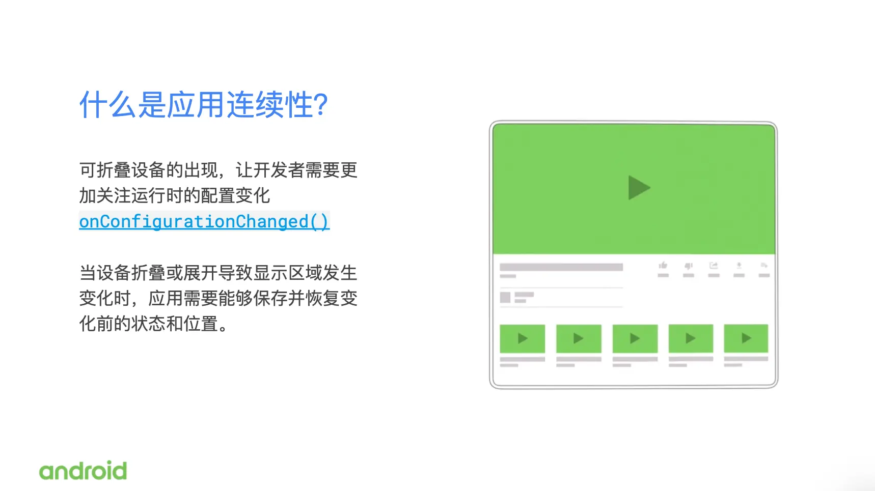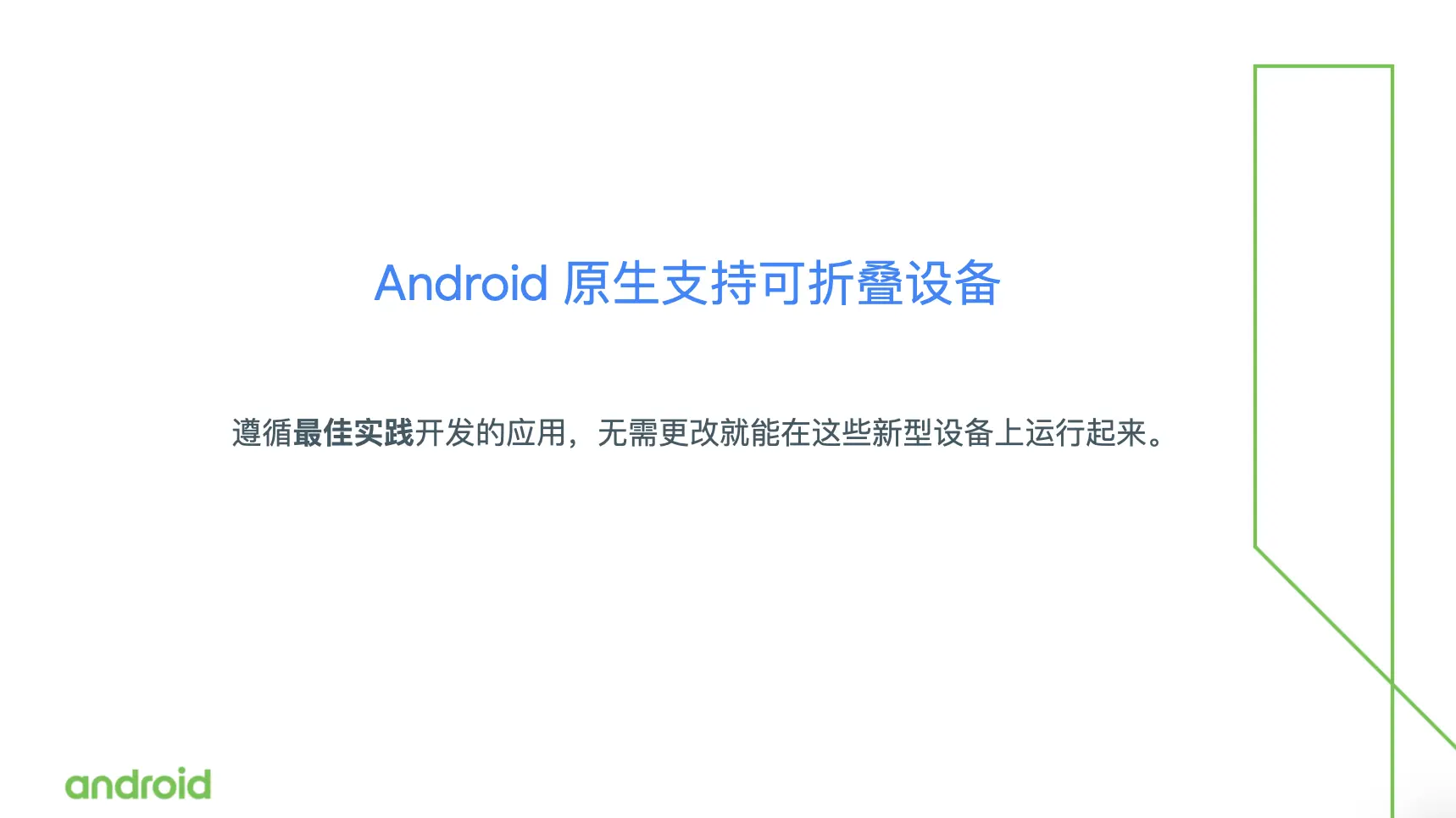 在去年11月份,我们举办了每年一度的 Android 开发者峰会,在开发者峰会上我们就宣布了 Android 系统会对折叠屏设备提供原生支持。这也就意味着如果你在开发应用的时候,遵循了我们推荐的最佳实践做法去实现你的应用,那么你的应用不需要做任何更改就能在这些新型的设备上运行起来。