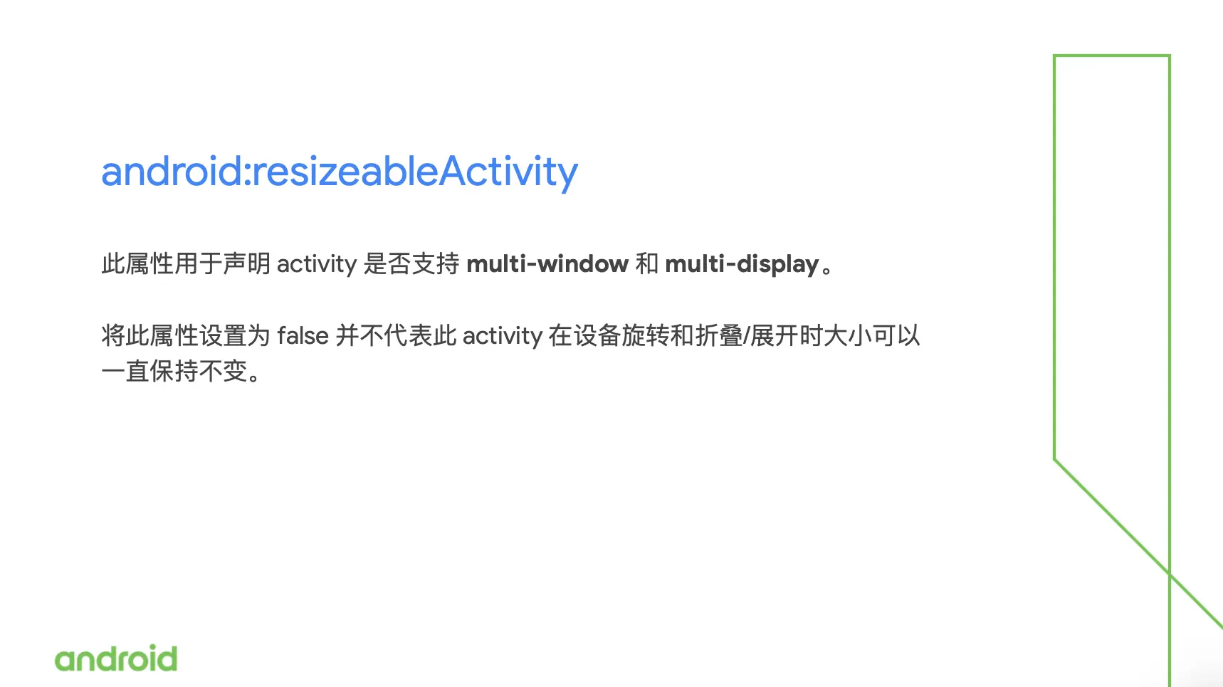 这个属性表明的是 activity 和 application 是否能够启用或者禁用多窗口显示?如果这个属性的值设置为 true,表示 activity 能够以分屏和自由形状模式启动,如果属性设置为 false,并不是说你的 activity 就绝对不会被调整大小,实际上它表示的是 activity 它不能支持多窗口模式。如果这个值被设置为 false,且用户尝试在多窗口模式下去启动,那么 activity 就会被以全屏方式展示给用户,