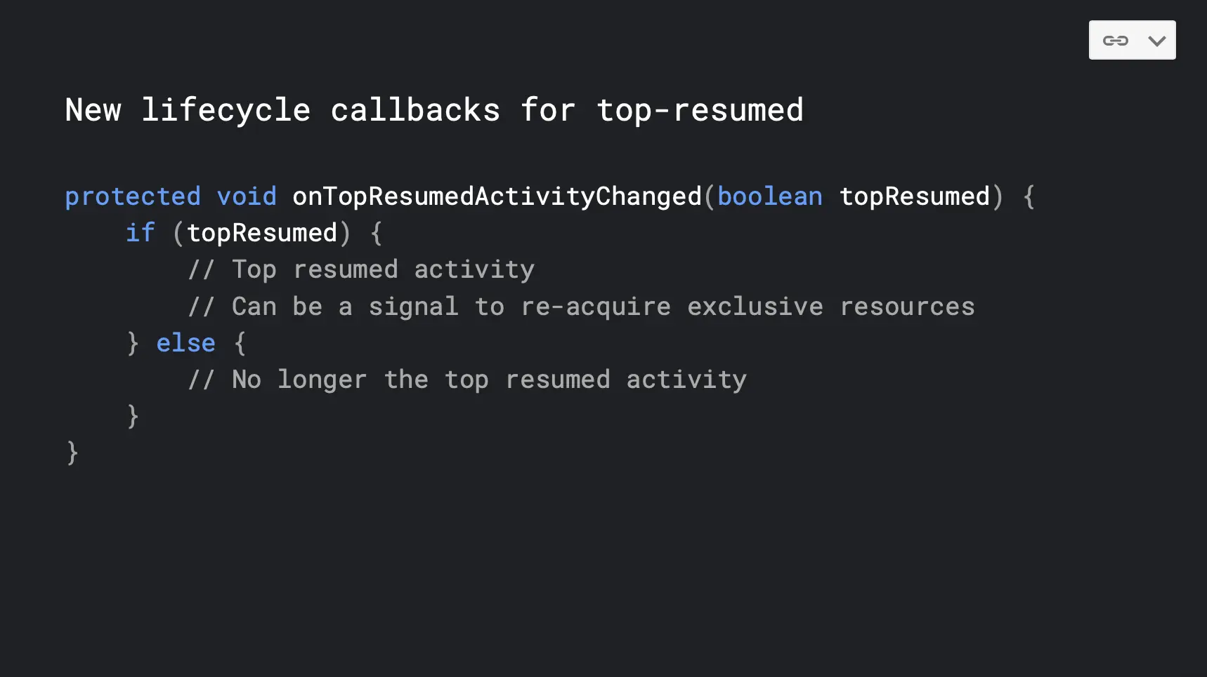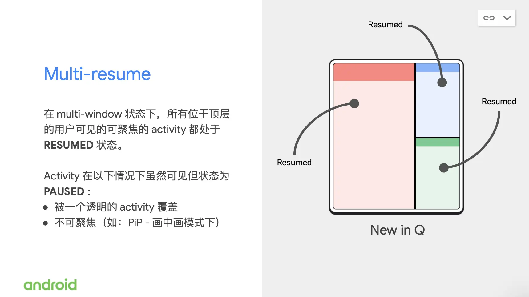 我们还在 Android 里面为 Activity 添加了一个新的状态叫 topResumed。因为我们刚刚提到在 Q 之前的系统版本上,同一时间只会有一个 activity 处于 resume 这种状态。所以在 Q 上新增的 topResumed 这种状态下你可以认为它基本上是等同于在 Q 之前的版本上的 resume 状态的。