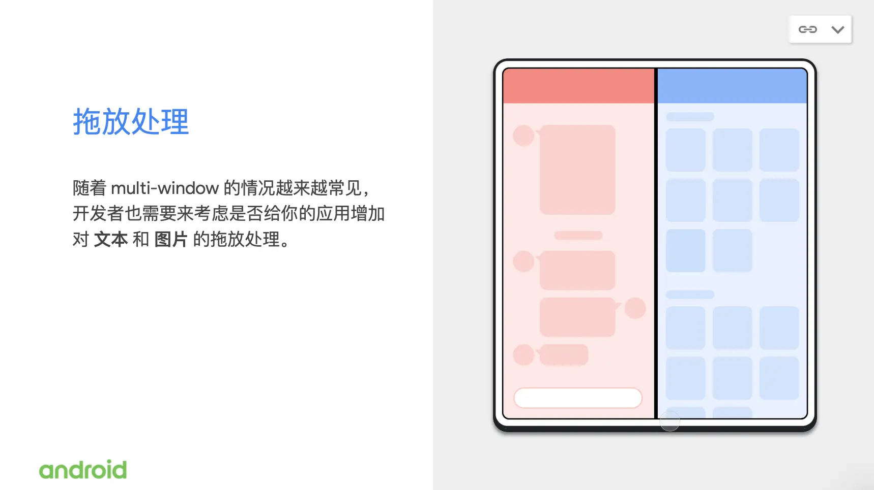 随着 multi-window的情况越来越常见,我们发现在之前的系统版本上一些不太可能出现的操作现在也变得可能了,比如说之前在手机操作上,通常不会有用户需要将一段文字或者是一个图片从一个应用里拖放到另一个应用里的情况。但是随着多窗口状态的出现,很可能用户就会有这种需求。如果你的应用恰巧是一个有可能出现这种用户场景的应用,那么我们建议你现在就应该可去考虑是否对你的应用增加对文本和图片的拖放处理。