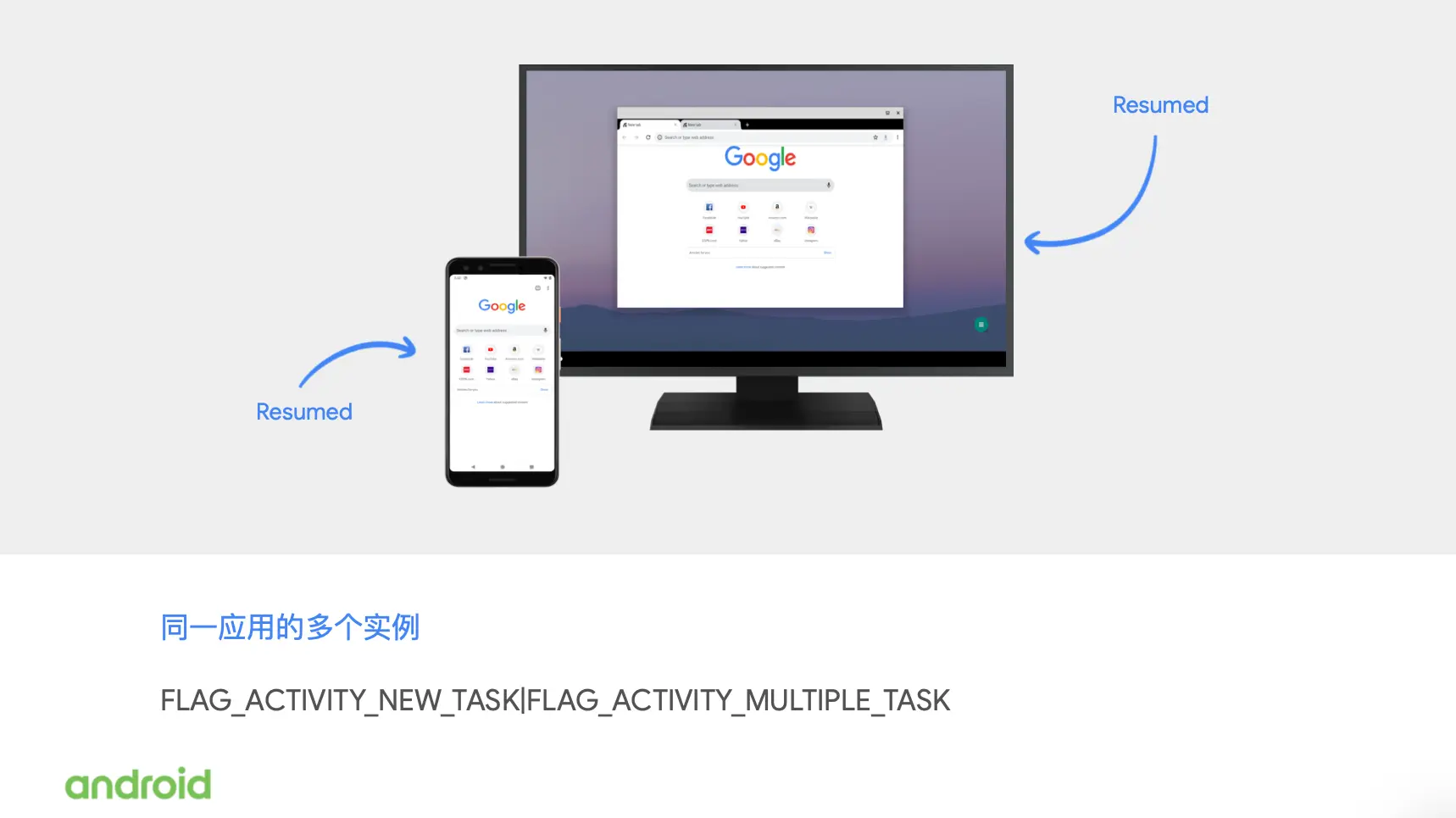 如果你声明你的 Activity 它的启动模式可以支持多个实例并存,那么当它在辅助屏幕上启动的时候,就会创建一个新的 Activity 体实例。这里演示的是调用者请求在第二个显示器,也就是手机连接的外置显示屏上使用 new task 和 multitask 这两个标志去启动一个新的 Activity,这里就会创建一个新的 chrome 窗口。