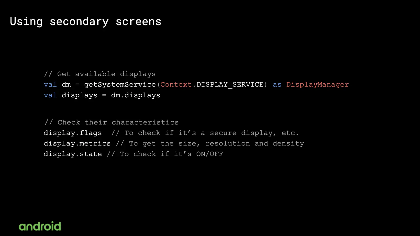 如果你的应用希望去显示连接到当前的系统的额外的显示屏幕怎么办?第一部是通过使用 DisplayManager 去检查当前连接到当前系统中的所有显示内容。不同的显示器可能会具有不同的特征,你可以去调用接口去检查每一个显示设备的指标信息标志还有状态,并确认你是否需要去使用这些显示设备。