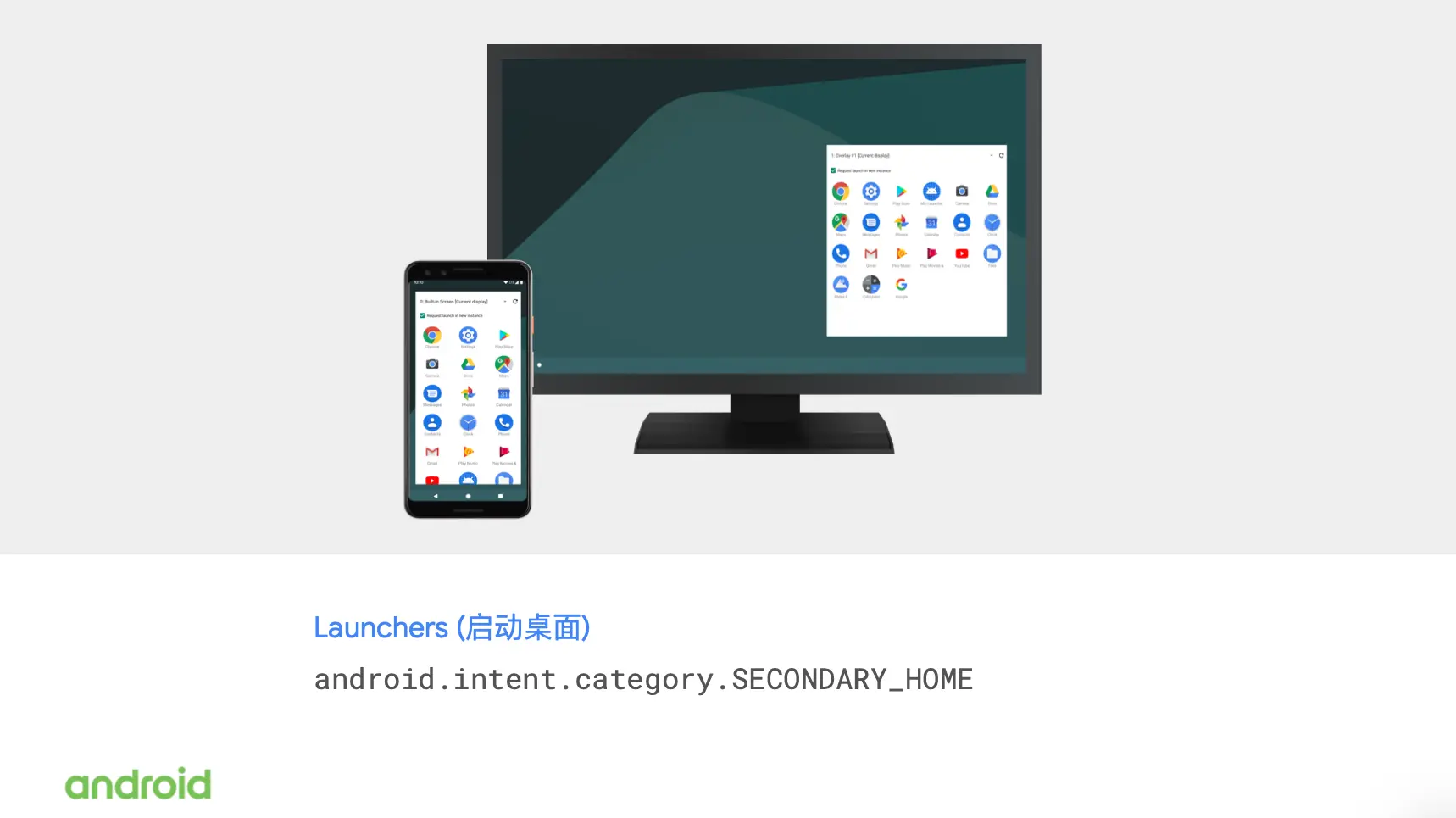 在 AOSP 当中的 launchers 这个类就实现了专有 Activity 类别。那么我们在 AOSP 当中还有一个 multi-display 的启动器事例,展示了如何去使用新的功能。