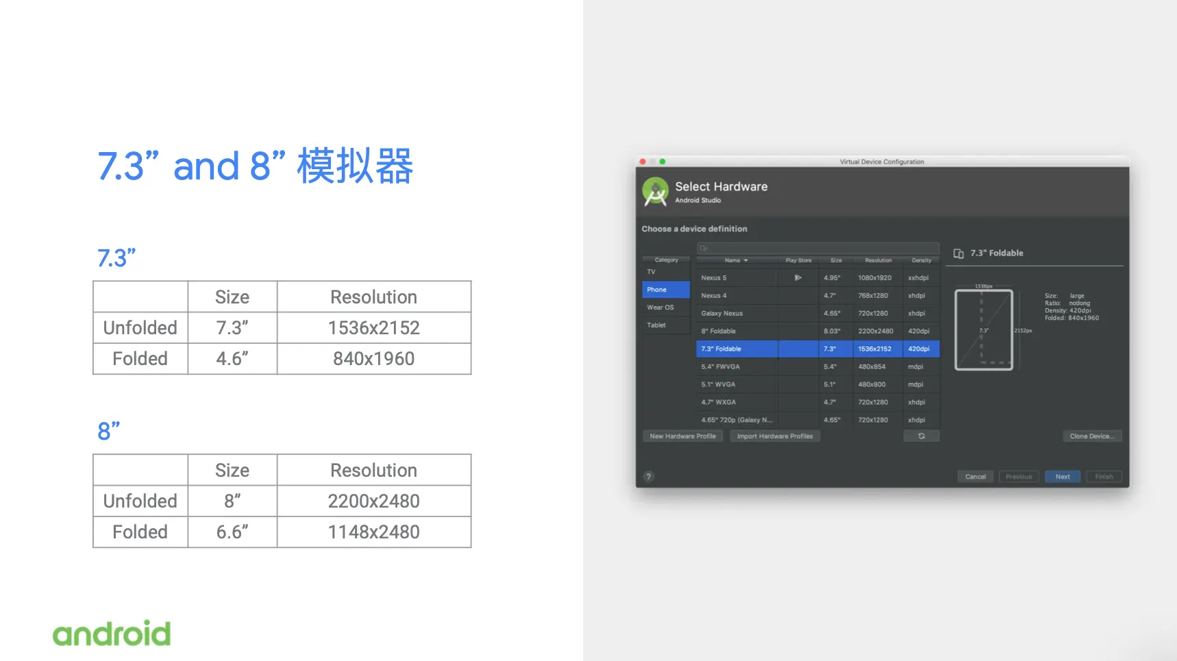 如果你现在有 Android studio3.5,你可以在 AVD 当中去看到,我们现在提供了7.3英寸和八英寸的折叠屏设备的模拟器,如果今后我们看到有其他尺寸的折叠屏手机上市,我们也会在 AVD 里面增加相应的模拟器尺寸的选项。