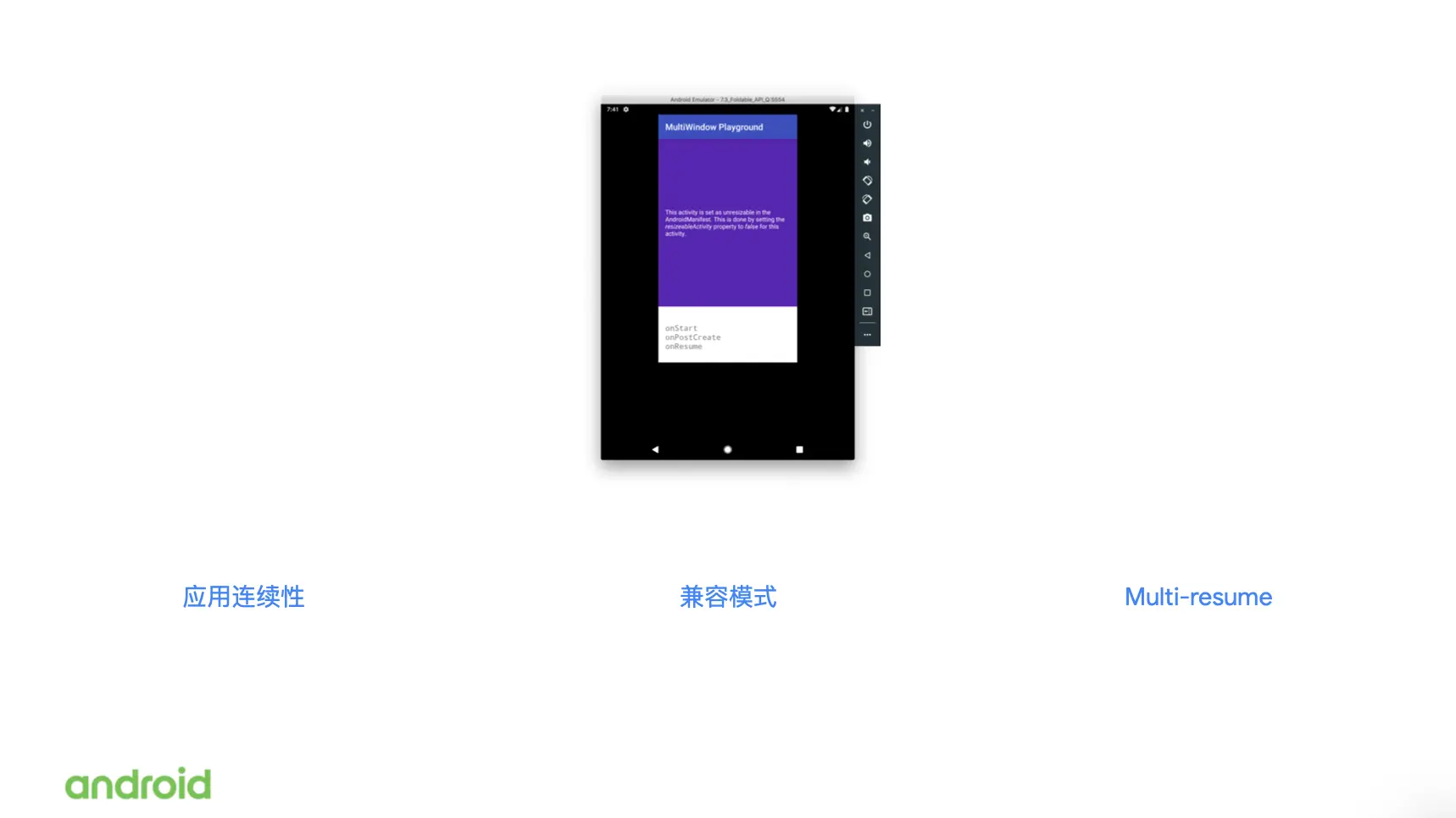 通过这些模拟器,你现在就可以立即开始测试你的应用,在这些最新的折叠屏手机上的用户体验,你甚至可以去模拟折叠屏手机被折叠和打开的情况来测试你的应用程序的连续性。如果你的应用他声明了自己所能支持的最大或者最小长宽比,你现在还可以通过模拟器去看到在 lock box 模式下你的应用的呈现效果。当然你也可以通过模拟器去测试 multi-resume 这种状态下你的应用程序的表现。