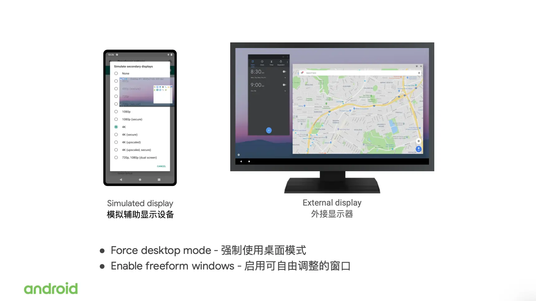为了帮助开发者能够在真实的设备上去测试 multi-display 的展示效果,在 Android Q 中我们还增添了一个新的开发者选项,叫强制使用桌面模式。