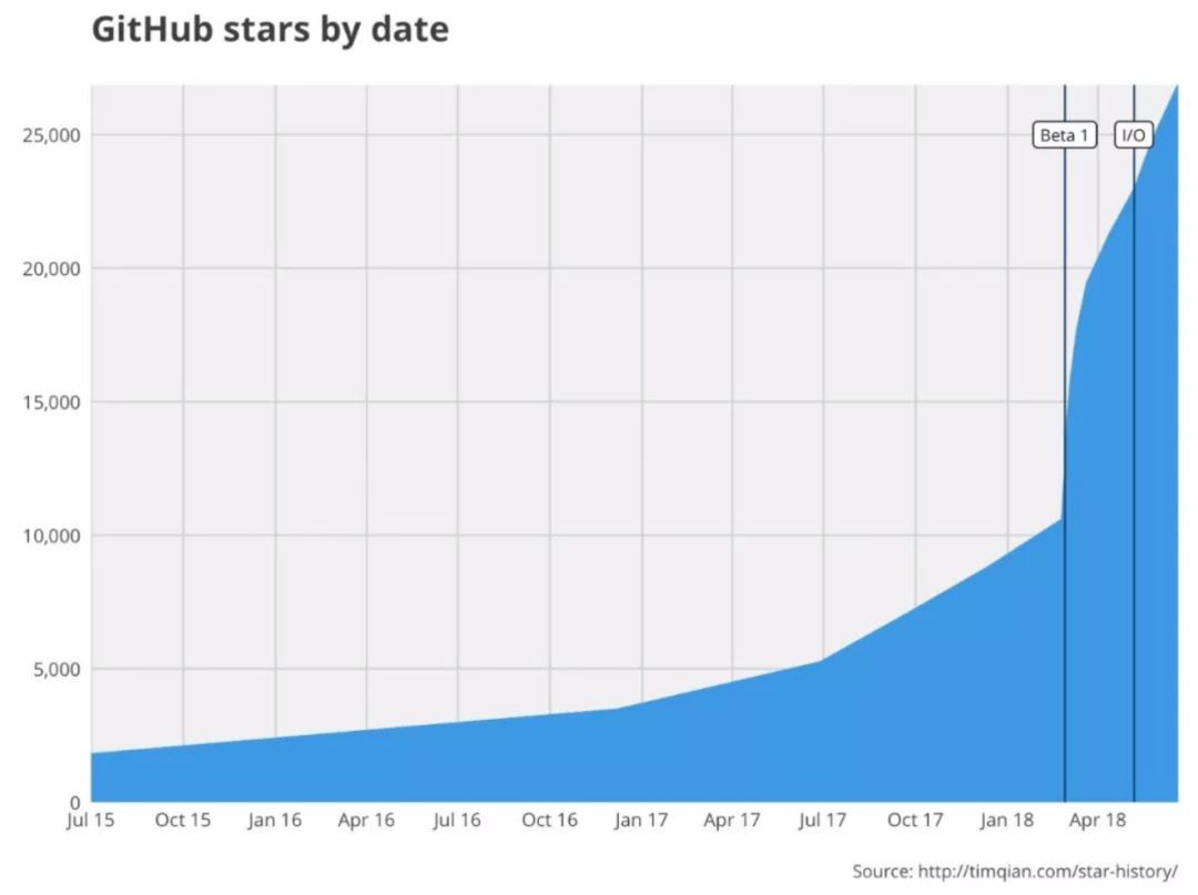 在Google刚推出Flutter时,其发展很缓慢,终于在18年发布第一个Beta版之后迎来了爆发性增长,发布第一个Release版时增长速度更快。可以从Github上Star数据看出来这个增长的过程。在19年最新的Flutter 1.2版本中,已经开放Web支持的Beta版。