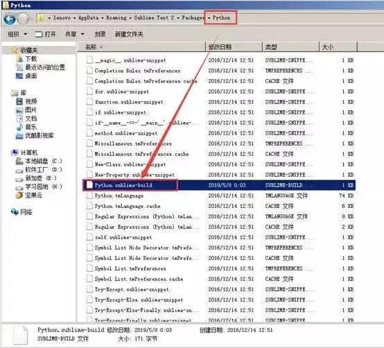 4、在这堆文件夹中找到Python这个文件夹,如下图所示,然后进入该文件夹,找到Python.sublime-build这个文件。