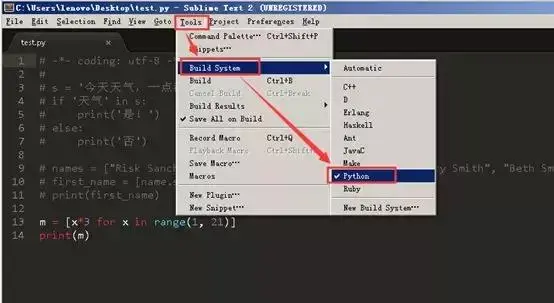 6、更改完Python.sublime-build文件之后,按下快捷键Ctrl+S进行保存即可。之后任意打开一个Python文件,然后在Sublime中依次点击选项卡ToolsàBuild SystemàPython,如下图所示,整个过程相当于完成了Sublime与Python解释器的完美“联结”。