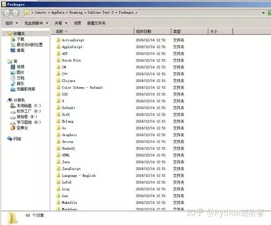 4、在这堆文件夹中找到Python这个文件夹,如下图所示,然后进入该文件夹,找到Python.sublime-build这个文件。