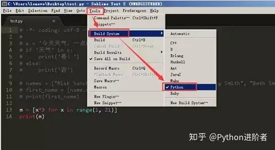 6、更改完Python.sublime-build文件之后,按下快捷键Ctrl+S进行保存即可。之后任意打开一个Python文件,然后在Sublime中依次点击选项卡ToolsàBuild SystemàPython,如下图所示,整个过程相当于完成了Sublime与Python解释器的完美“联结”。