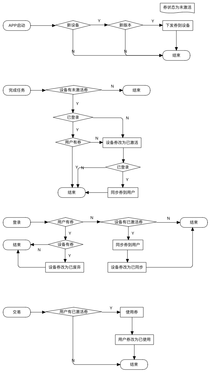 有一个需求是给APP的新用户送优惠券,当用户完成了某任务时就可以激活券,然后在发生交易时使用券。一开始接到这个需求以为很简单,做的时候才发现有问题,问题在这个券是支持未登录时下发,需要解决登录同步问题,整体流程如下: