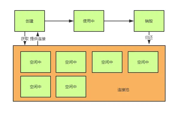 因此,当使用连接池后,我们使用一个连接的生命周期将会演变成这样: