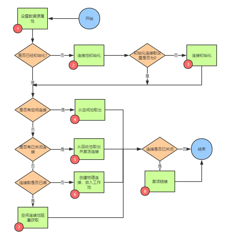 经过上述分析,要完成一个连接池,需要这些模块的配合,总体流程如下: