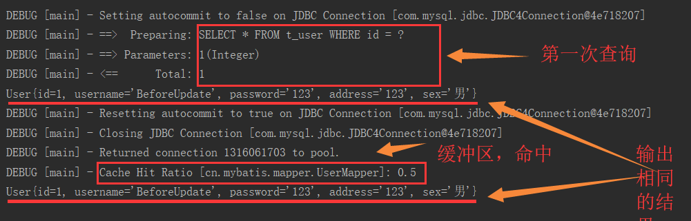 做个简单的测试:按照上面的图中所示,我们查询两次id=1的User信息,并且两次查询期间没有进行会清空缓存的操作,结果应该是只向数据库发送一次Sql查询