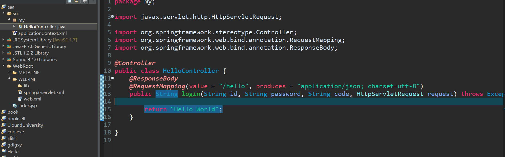 需要注意的是控制器的包名我填的是my,也就是要在my包下写接口 另外xml的前面的名字要和web。xml里的servlet名字相同,如果不明白的话就直接复制粘贴