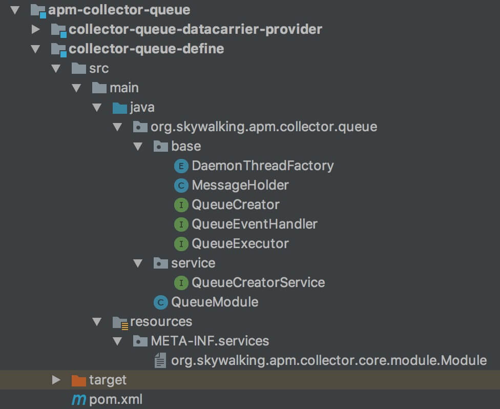 collector-queue-define:定义队列组件接口。collector-queue-datacarrier-provider:基于 apm-datacarrier 的队列组件实现。目前暂未完成。collector-queue-zookeeper-provider:基于 Disruptor 的队列组件实现。