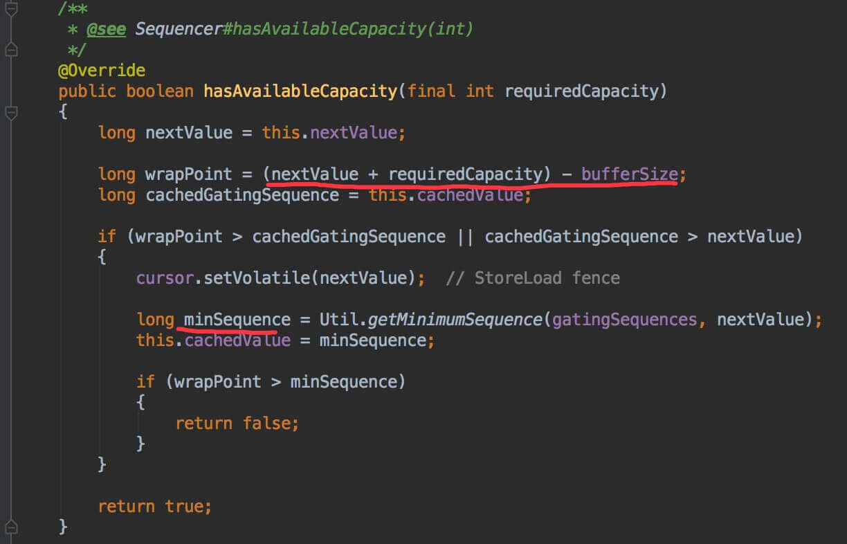 SingleProducerSequencer#hasAvailableCapacity(requiredCapacity)方法,代码如下: