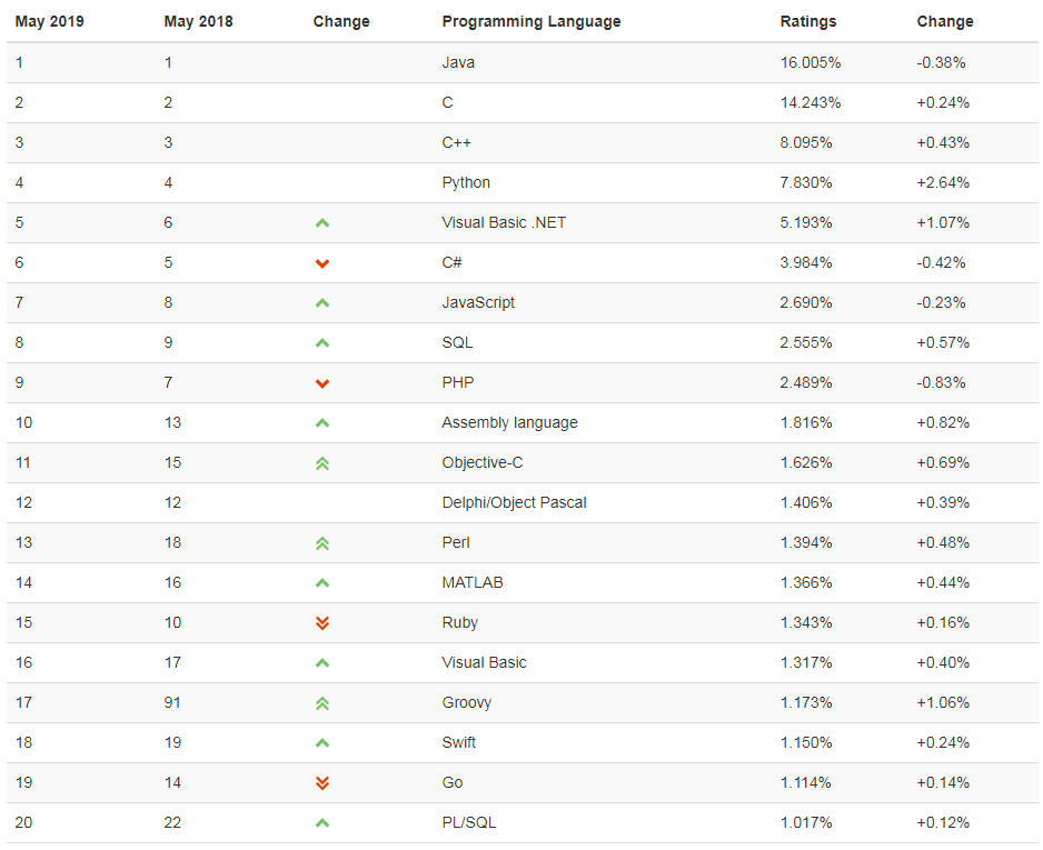 所以导致 R 语言排名下跌的锅要 Python 来背?再加上与 C++ 排名的差距越来越小,Python 这个月俨然是“大赢家”。 TIOBE 5月编程语言排行 1-20