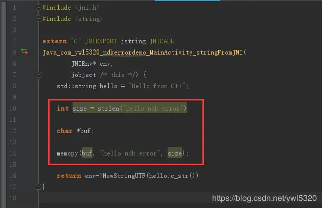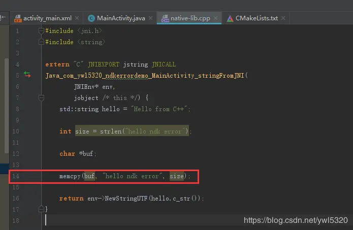 这样我们就定位到了是在native-lib.cpp文件中的第14行出错了,找到定位行(.so路径是在AS中build文件夹中,可以参考上图中路径,最后.so的路径要根据自己的设备CPU类型来旋转,我这里是armeab-v7a的):