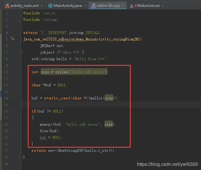 我们可以用Android Studio创建一个最简单的NDK项目(如果不会创建NDK项目,可参考我前面《Android Studio通过cmake创建FFmpeg项目》博客),然后在自带的C++代码里面添加我们自己的出错代码: