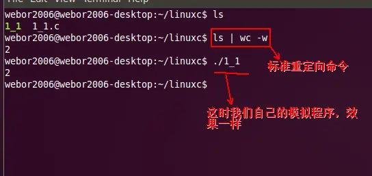 因为ls命令标准是输出到标准输出设备(屏幕)当中,wc命令是从标准输入设备获取数据,而现在,我们希望ls命令输出到管道的写端,而wc命令是从管道的读端获取数据,那该怎么办呢?文件描述符的复制既可达到这个目的,具体代码如下: