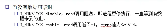 下面,再来验证“O_NONBLOCK enable:read调用返回-1,errno值为EAGAIN”这条理论,所以我们将read的文件描述符设置为非阻塞模式(O_NONBLOCK),如下: