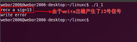 从运行结果来看,确实wirte error没有执行到,是因为write操作产生了SIGPIPE信号,从这个运行结果可能不是很确实就是产生了这个信号,那我们改变一下SIGPIPE的默认行为,就能知道了,修改代码如下: