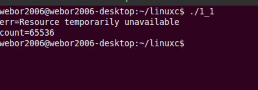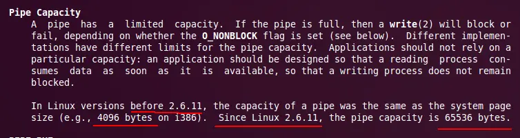 这次,可以清晰地看到,当管道写满时是不会阻塞的,且返回了错误码为EAGAIN,而且可以看到管道的最大容量为65536个字符,也就是64K的容量,实际上,关于这个,可以在man帮助中查找到: