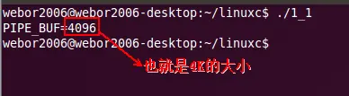 【说明】:上图中提示的"写入原子性"是指:如果写入的数据量不大于PIPE_BUF,假如有两个进程同时往管道中写入数据,意味着第一个进程写入的数据是连续的,也就是中途不会插入第二个进程写入的数据,有点类似于线程的同步机制,同理不保证写入的原子性也就明白了。另外PIPE_BUF的大小是多少呢?咱们先来打印一下它的值: