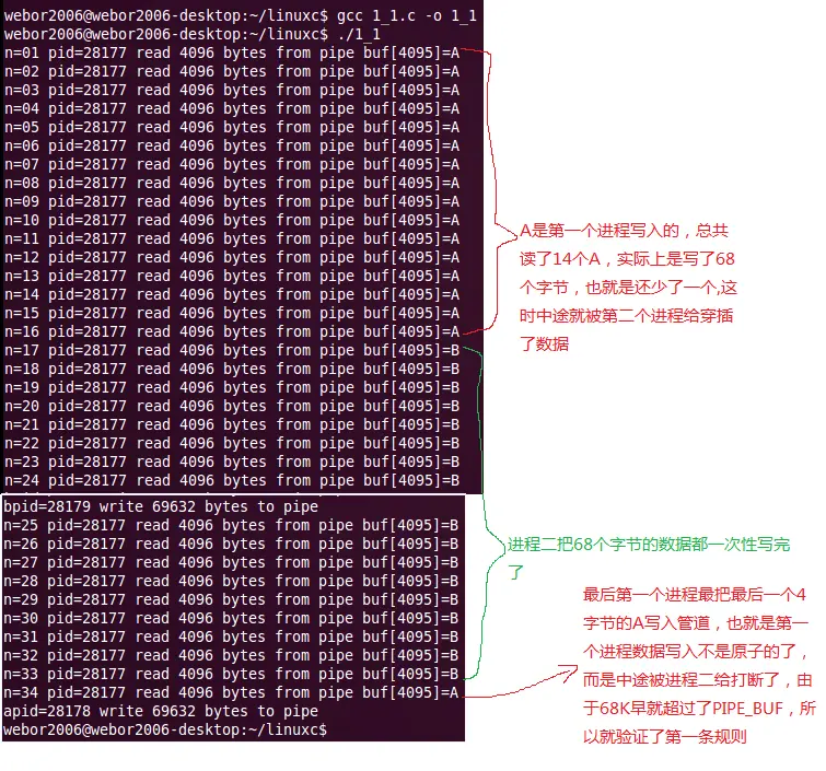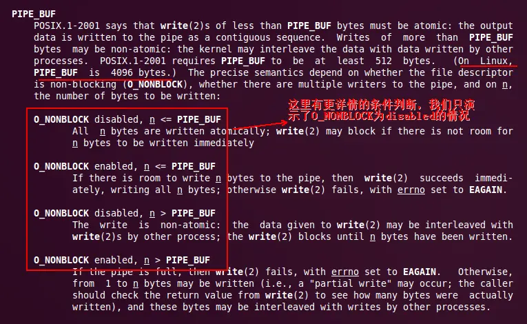 关于小于PIPE_BUF这时就不演示了,这种情况肯定是能保证原子性的,关于这些规则,实际上在man帮助里面都可以看到: