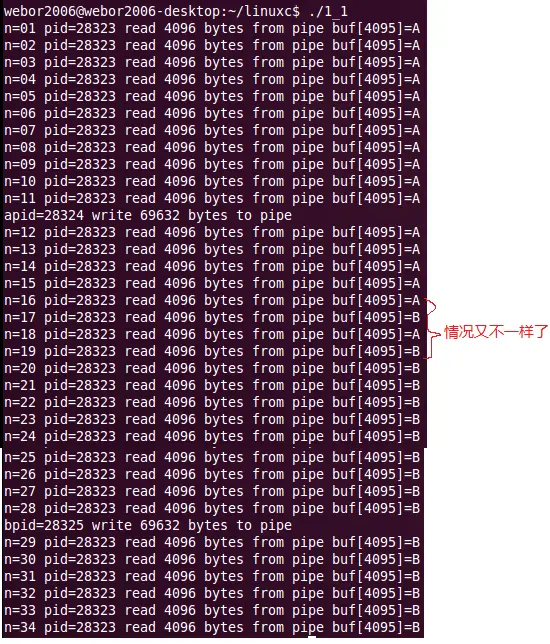 printf("n=%02d pid=%d read %d bytes from pipe buf[4095]=%c\n", n++, getpid(), ret, buf[4095]);