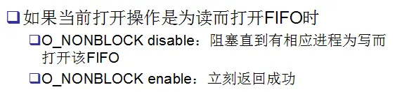 当有写进程打开该管道时,那么读进程就会由阻塞返回,也就论证了“O_NONBLOCK disable:阻塞直到有相应进程为写而打开该FIFO”。