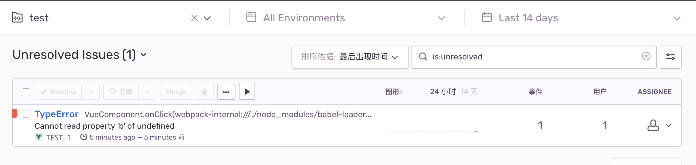 然后我们在代码里制造一个错误,就可以让 sentry 捕获了。本地如何模拟线上环境访问dist下的文件呢?需要装一个 http-server ,在dist文件夹下启动一个http服务就可以了。