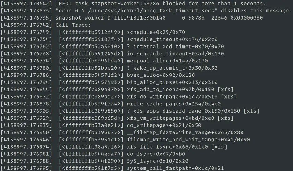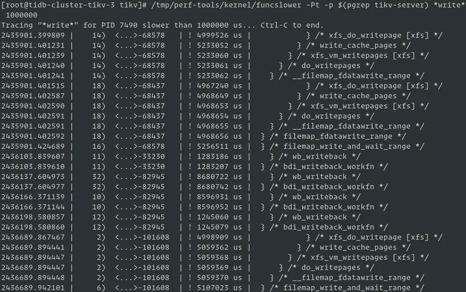 我们使用 perf-tools 中的 funcslower trace 来执行较慢的内核函数并调整内核参数 hung_task_timeout_secs 阈值,抓取到了一些 TiKV 执行写操作时的内核路径信息: