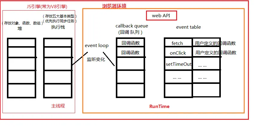 首先,这是一个浏览器环境,其中主线程操作堆和执行栈,而RunTime中存在着许多web API,当主线程读取到setTimeOut等API时,它会交给其他线程来处理(setTimeOut则是定时器触发线程),定时器触发线程会先将setTimeOut中的回调函数存放在event table中,当满足触发条件时(如上面的4ms),就将回调函数推入事件队列(callback queue)中,等待主线程空闲(执行栈中为空),回调函数则被推入执行栈中进行执行。