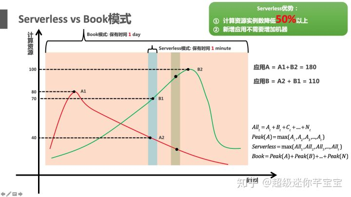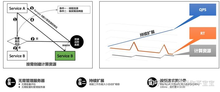 - 价值二:持续扩展;之前的做法是每个应用程序独占一定数量的资源,如果变成Serverless 模式,所有应用程序可以共享资源池,每个应用程序几乎可以无限扩展。