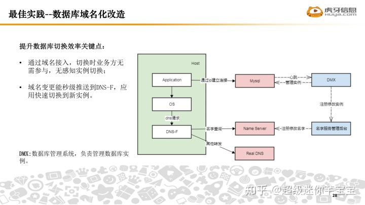 大家可以看一下这个图,这是我们现在做的一个改造,图中的 DMX 是虎牙内部的一个数据库管理系统,思路就是把 DMX 和名字服务打通。DMX 会把数据库实例信息以服务的形式注册到名字服务,服务名就是域名。