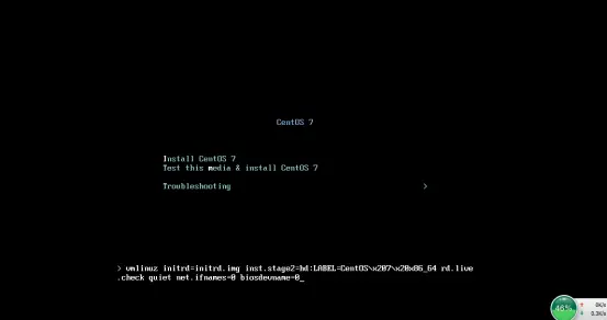 (1)点击启动虚拟机,等待一会,进入如下页面,按TAB键 输入:net.ifnames=0 net.biosdevname=0 回车。等待执行命令,进入安装页面。(如果要光标退出虚拟机按住Ctrl+Alt)