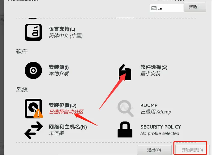 (2)点击软件选择,安装basic版(基础设施服务器版),并确认安装位置。最后点击开始安装