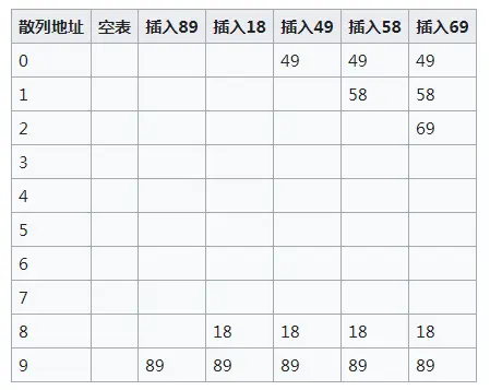 关键字为{89,18,49,58,69}插入到一个散列表中的情况。此时线性探测的方法是取 。并假定取关键字除以10的余数为散列函数法则。