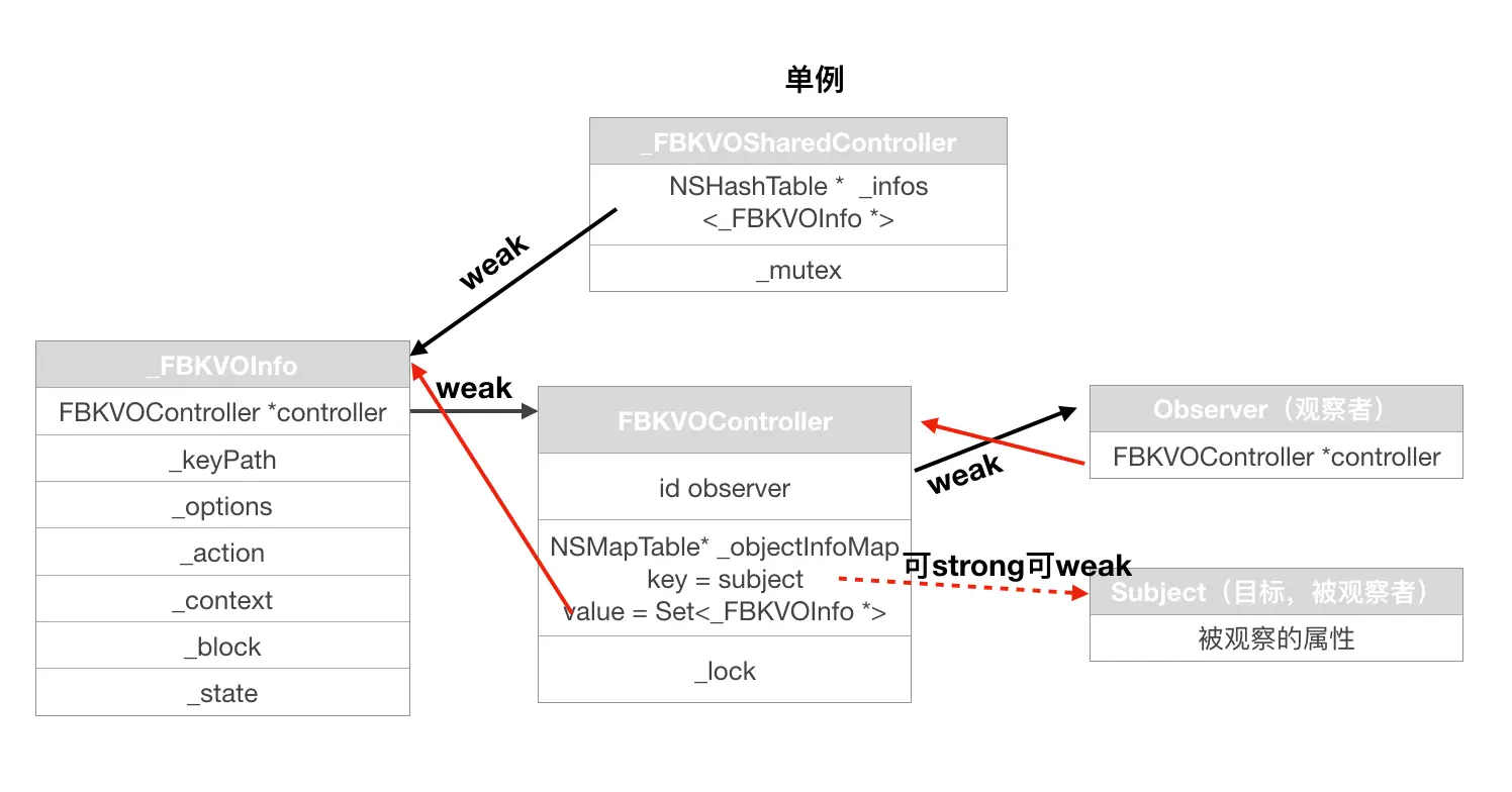 _FBKVOSharedController:单例。实现系统KVO的方法,自己作为observer,监听subject,并从FBKVOInfo中取出subject的信息。负责最后的监听的实现